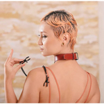 Indulge in the art of allure with the intoxicatingly deep reds of the Saffron Collar with Nipple Clamps. This seductive accessory is as captivating as a fine wine, making it the perfect addition to your intimate collection. Its exquisite black O Ring adds a touch of mystery and sophistication, creating a subtle and playful sensuality that works as a day collar for long term use. Experience a tantalizing sense of connection with the delicate chain, leading to the enticing nipple clamps, inviting you to explore the boundaries of pleasure. Embrace a world of possibilities as you embark on an intimate journey that's both elegant and evocative.